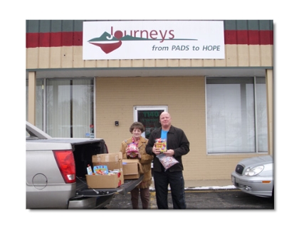 Foundation Director Peggy Slove and Foundation Founder/President Frank Slove delivering some candy to the homeless at Christmas time.